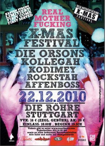 Nach dem Real Motherfucking Xmas Festival ist vor der Chimperator Betriebsfeier. Wie jedes Jahr geht es nach dem Konzert im Kreis der Familie weiter. Alle Chimperator Künstler und Mitarbeiter stoßen auf das erfolgreiche Jahr an um dann nackt in der Bowle zu baden und mit der Sekretärin zu knutschen. Natürlich bist Du auch eingeladen. Los geht’s ab 23:00 Uhr in der Schräglage. Festivalbesucher zahlen 2 EUR. Regulärer Eintritt kostet 4 EUR.
